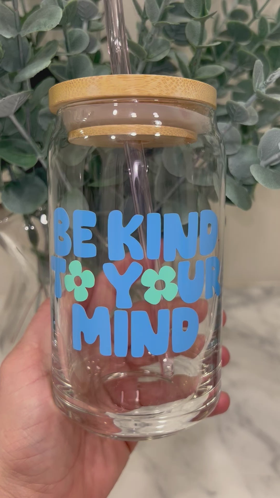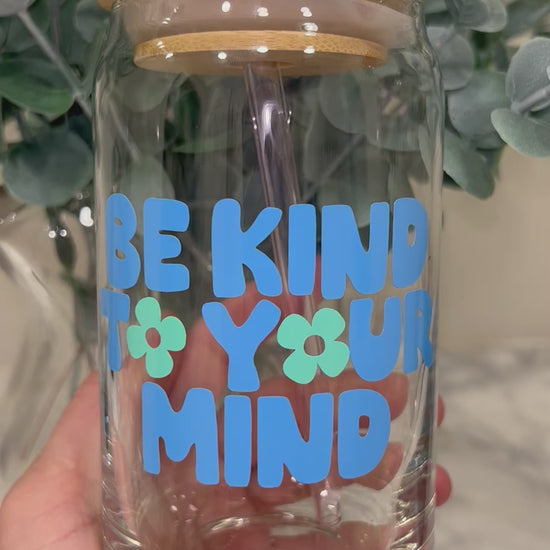 16 or 20 oz beer can glass with be kind to your mind logo in permanent adhesive vinyl. Part of our mental health matters collection.