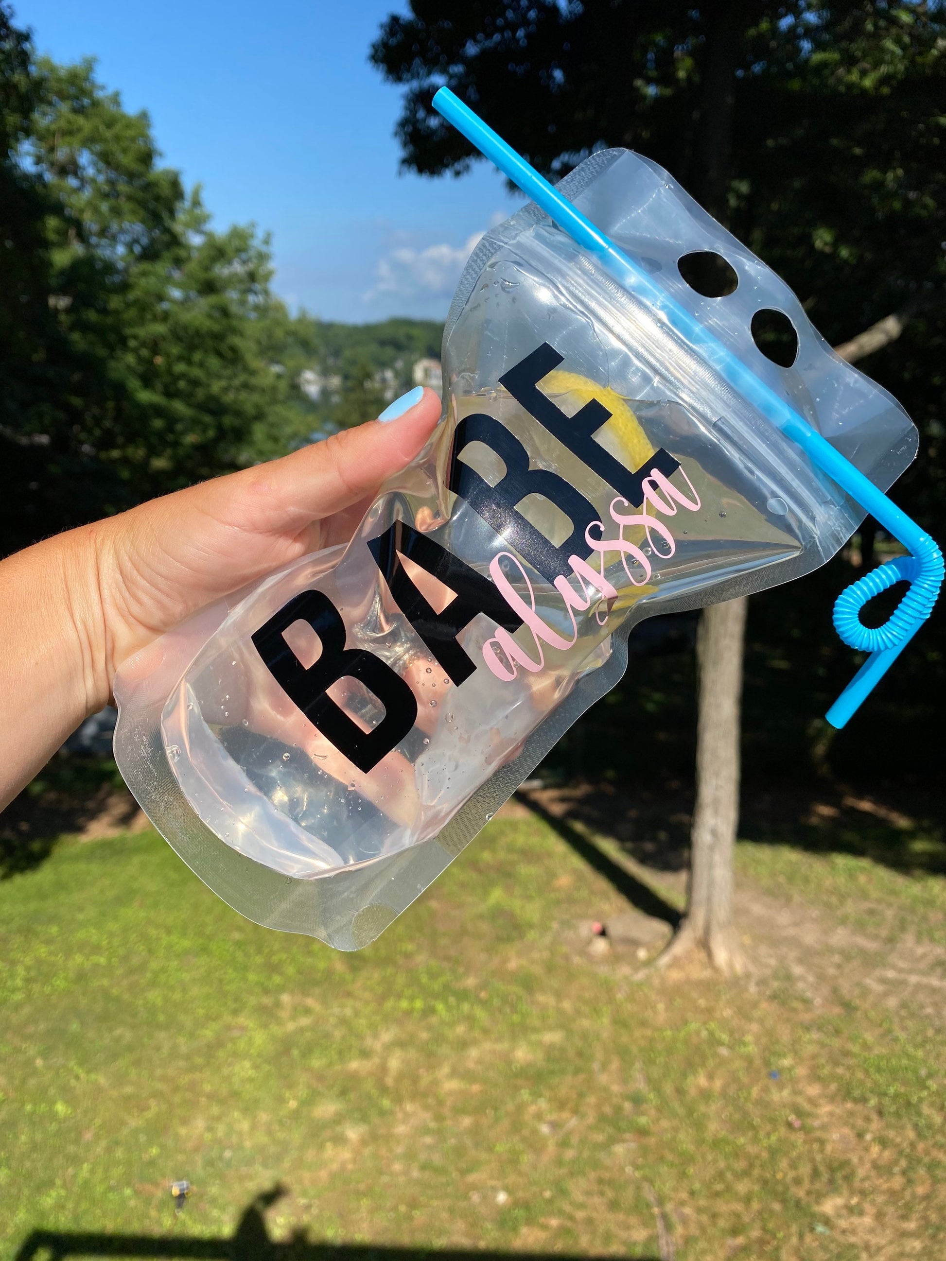 • Reusable stand up zipper drink pouch with straw.