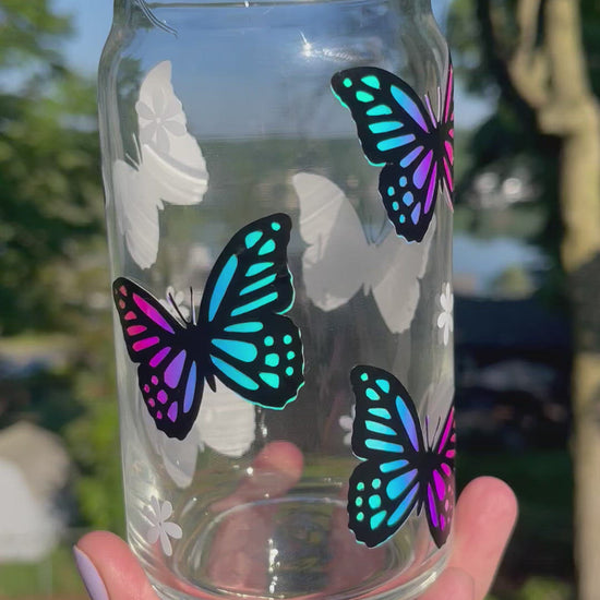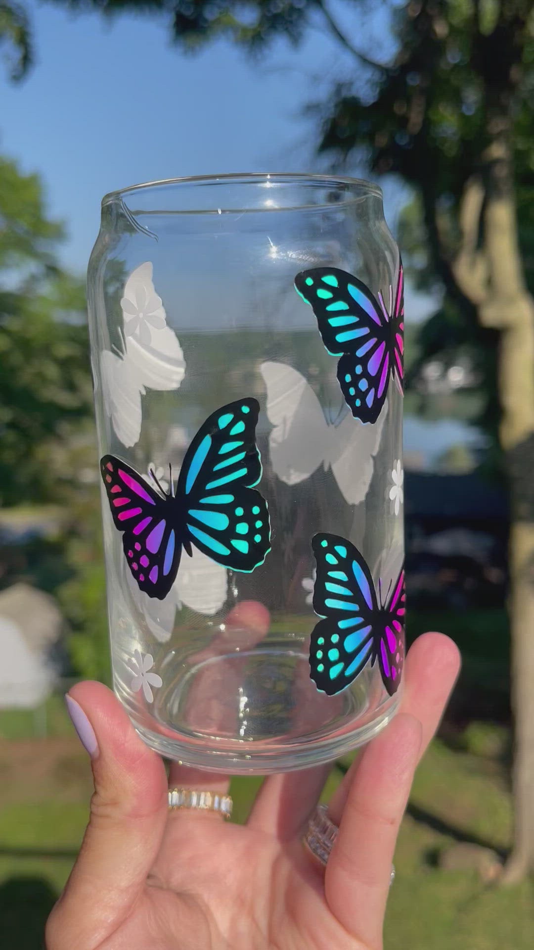 16 or 20 oz libbey beer can glass with the most beautiful holographic butterflies. Cups are made with vinyl. They are handwash ONLY!