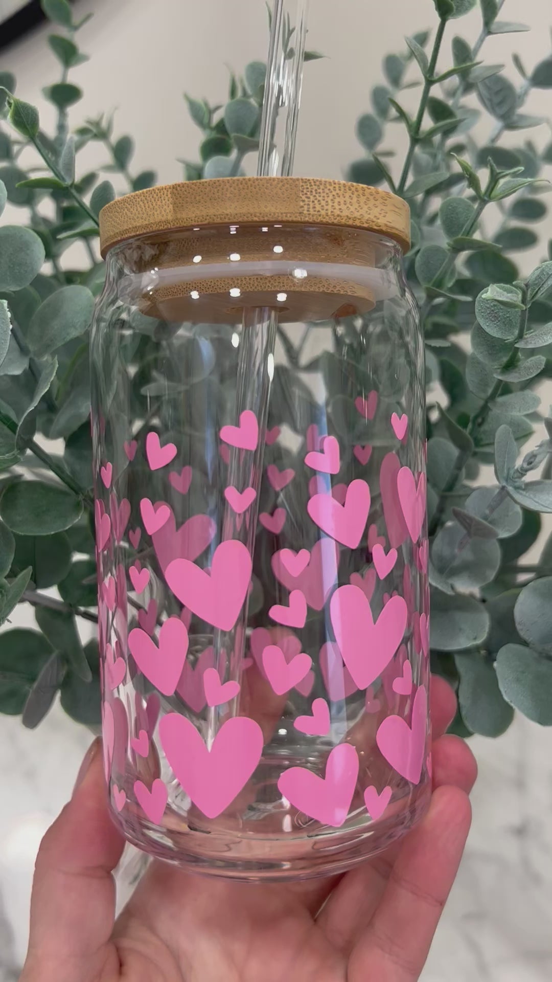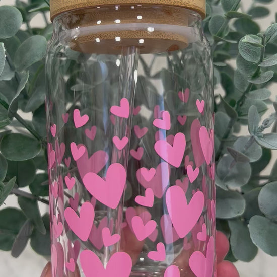 16 or 20 oz beer can glass with cascading hearts in permanent adhesive vinyl.