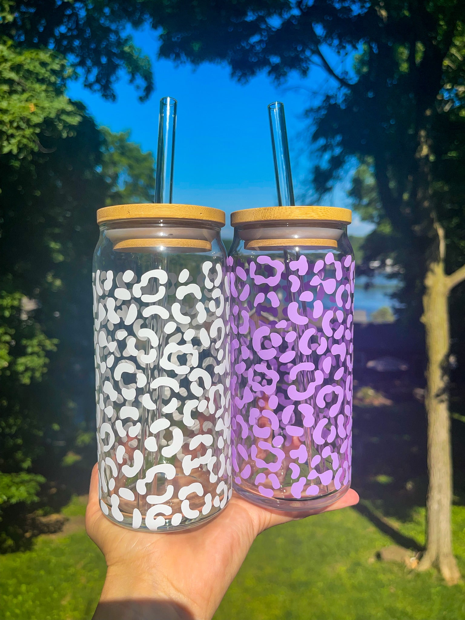 16 or 20 oz beer can glass decorated in a full wrap cheetah design