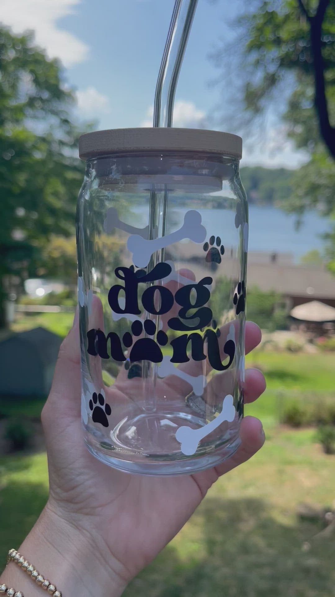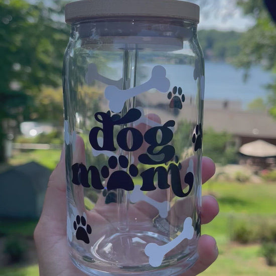 16 or 20 oz libbey can beer glass in a full wrap dog mom with bones and paw prints design. permanent adhesive vinyl decals are hand wash only!