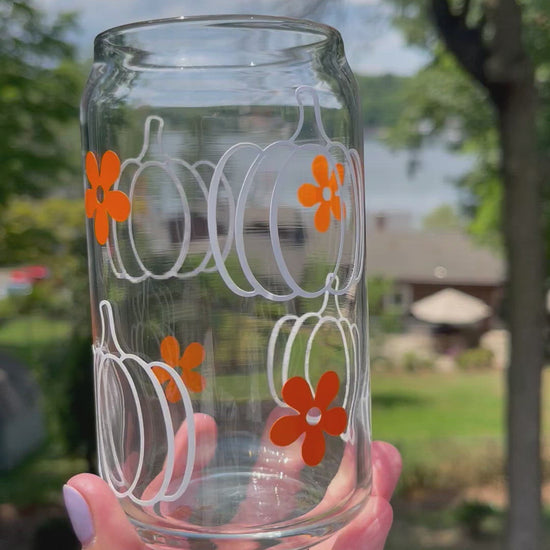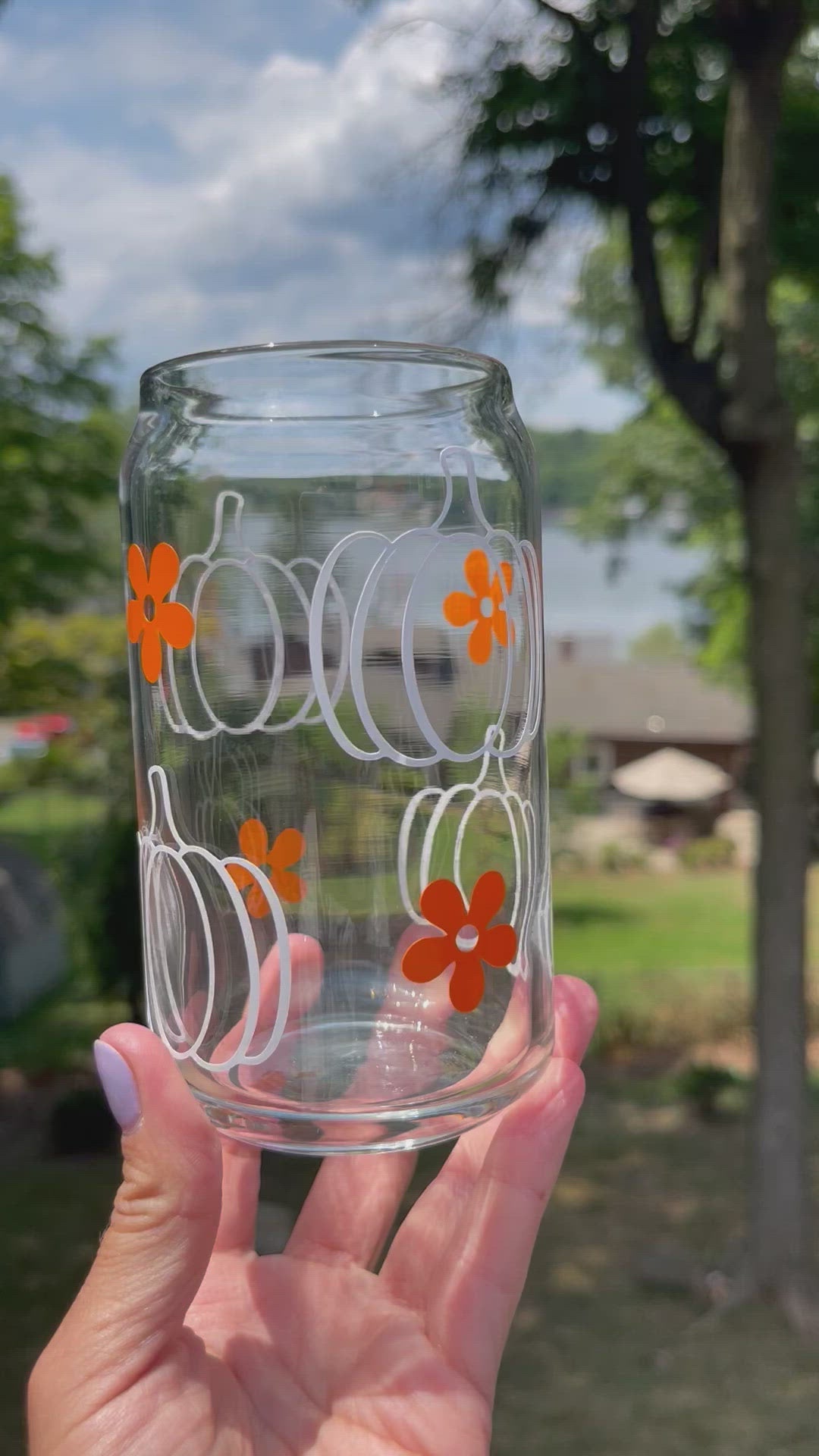 16 or 20 oz libbey can glass decorated with permanent adhesive vinyl in a pumpkin and groovy flower design