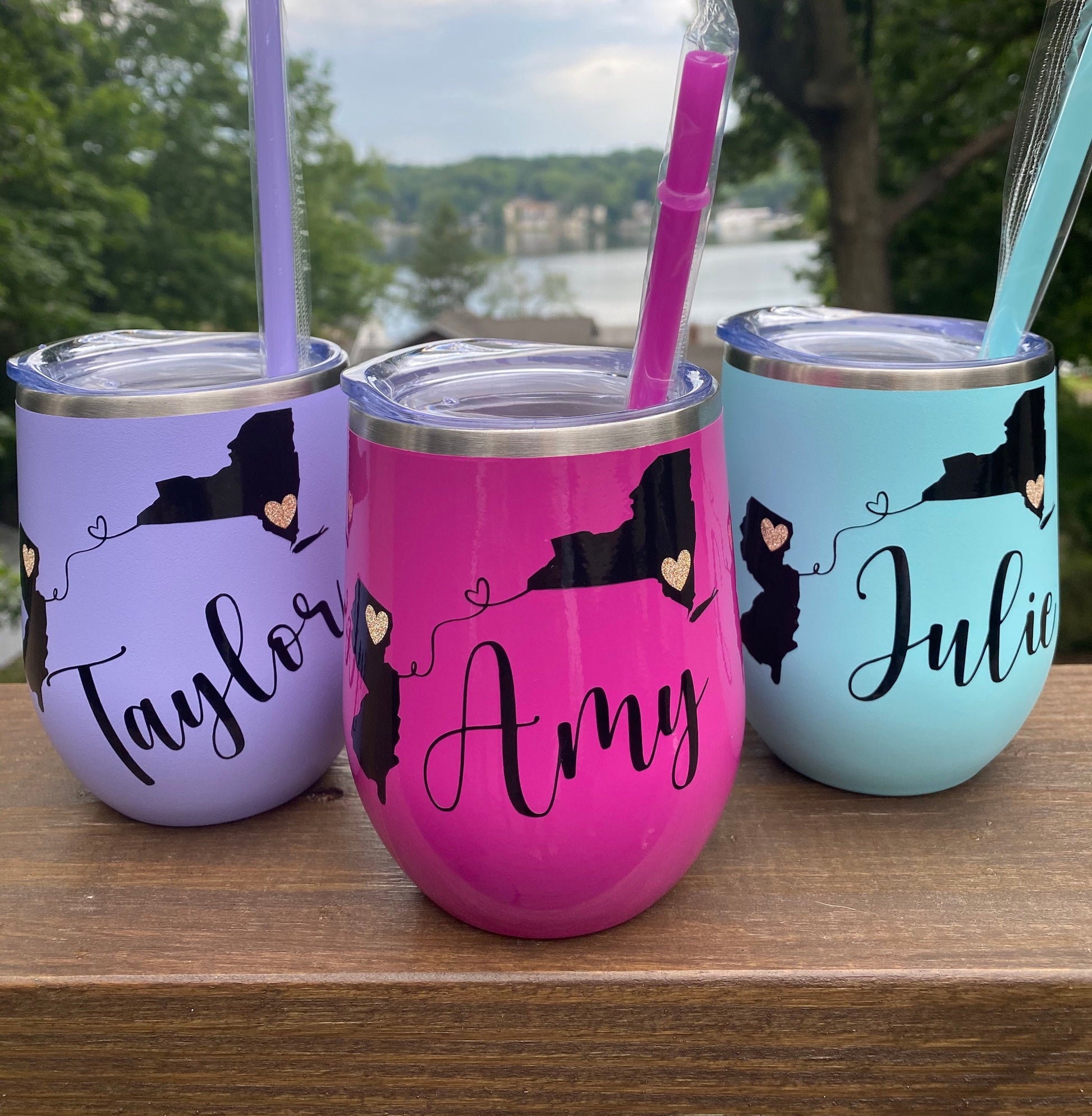 Show someone you miss them with this customized insulated wine glass. Put any states and colors you’d like! Many cup colors available. Message me for ordering details ❤️ ITEM DESCRIPTION Insulated Beverage Cup with Straw 12 oz. stainless steel 3” decal on front Two states connecting on back Can add third state if needed for additional price