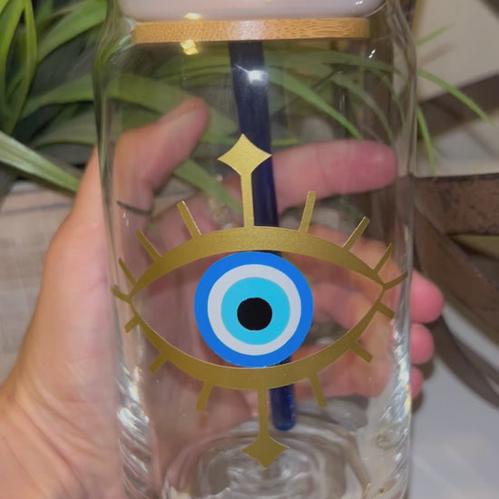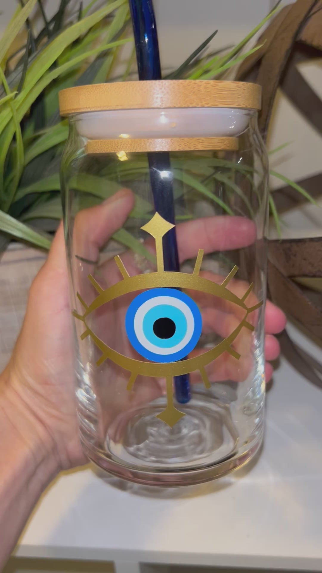 16 or 20 oz libbey can beer glass with a simple evil eye design. permanent adhesive vinyl decals are hand wash only!