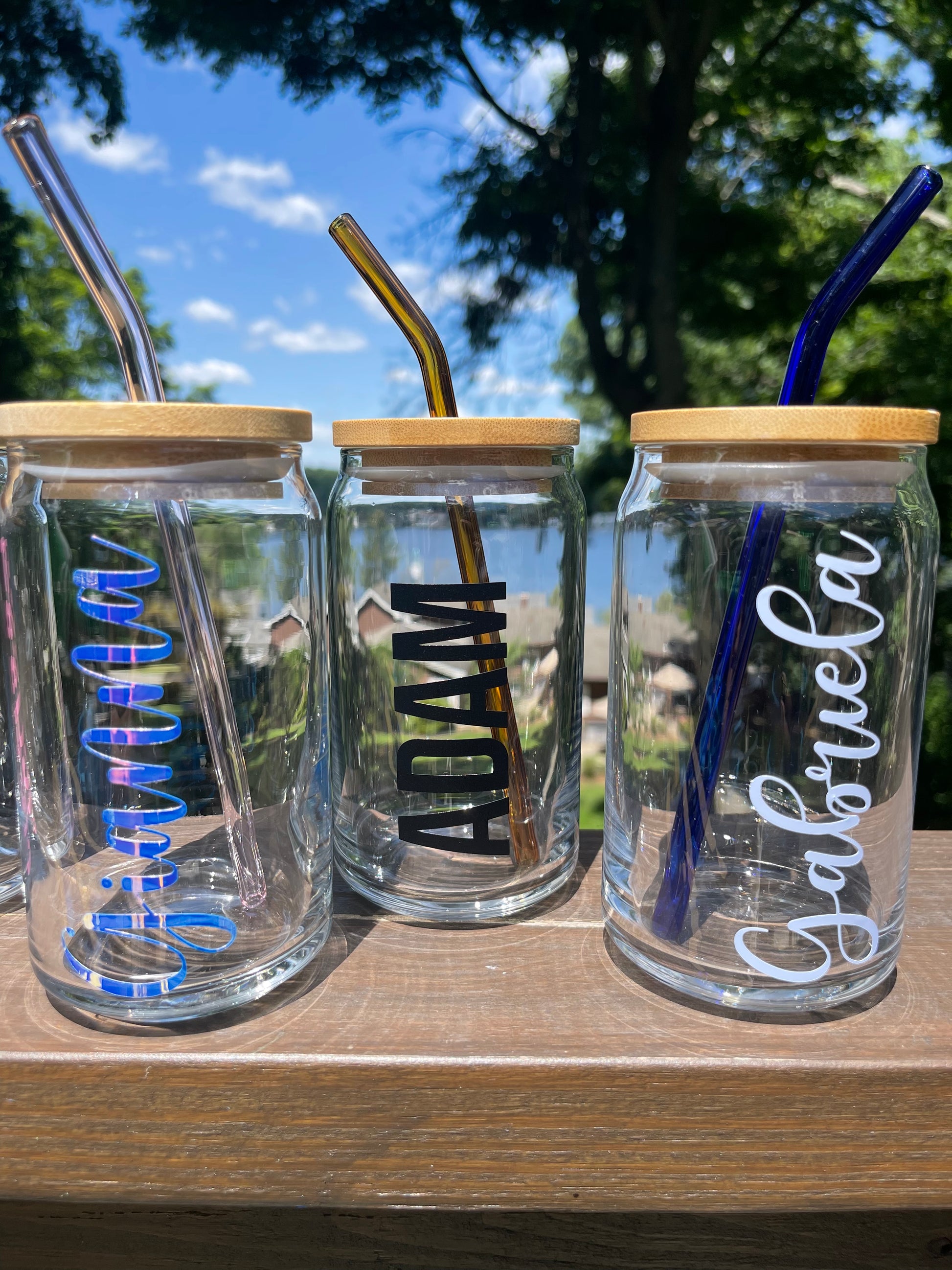 16 oz personalized beer can glass with your name or title on it! Choose your color vinyl and straw! Lid included as well!