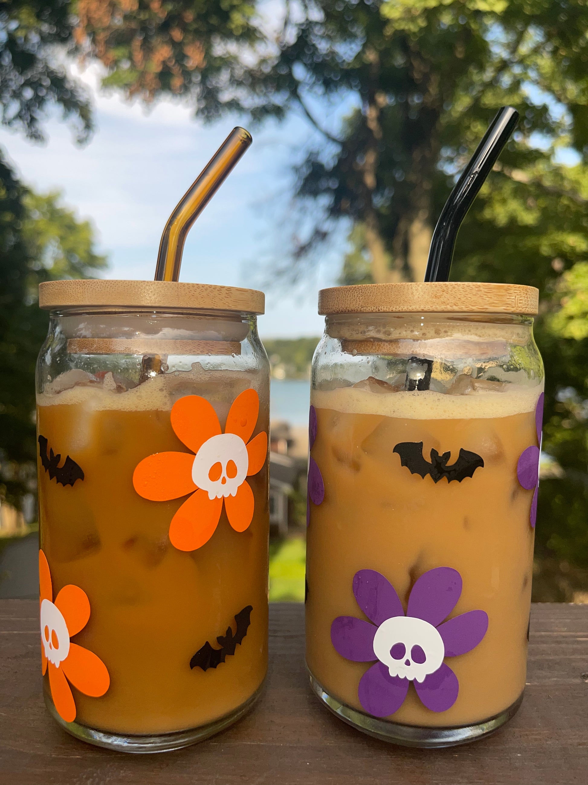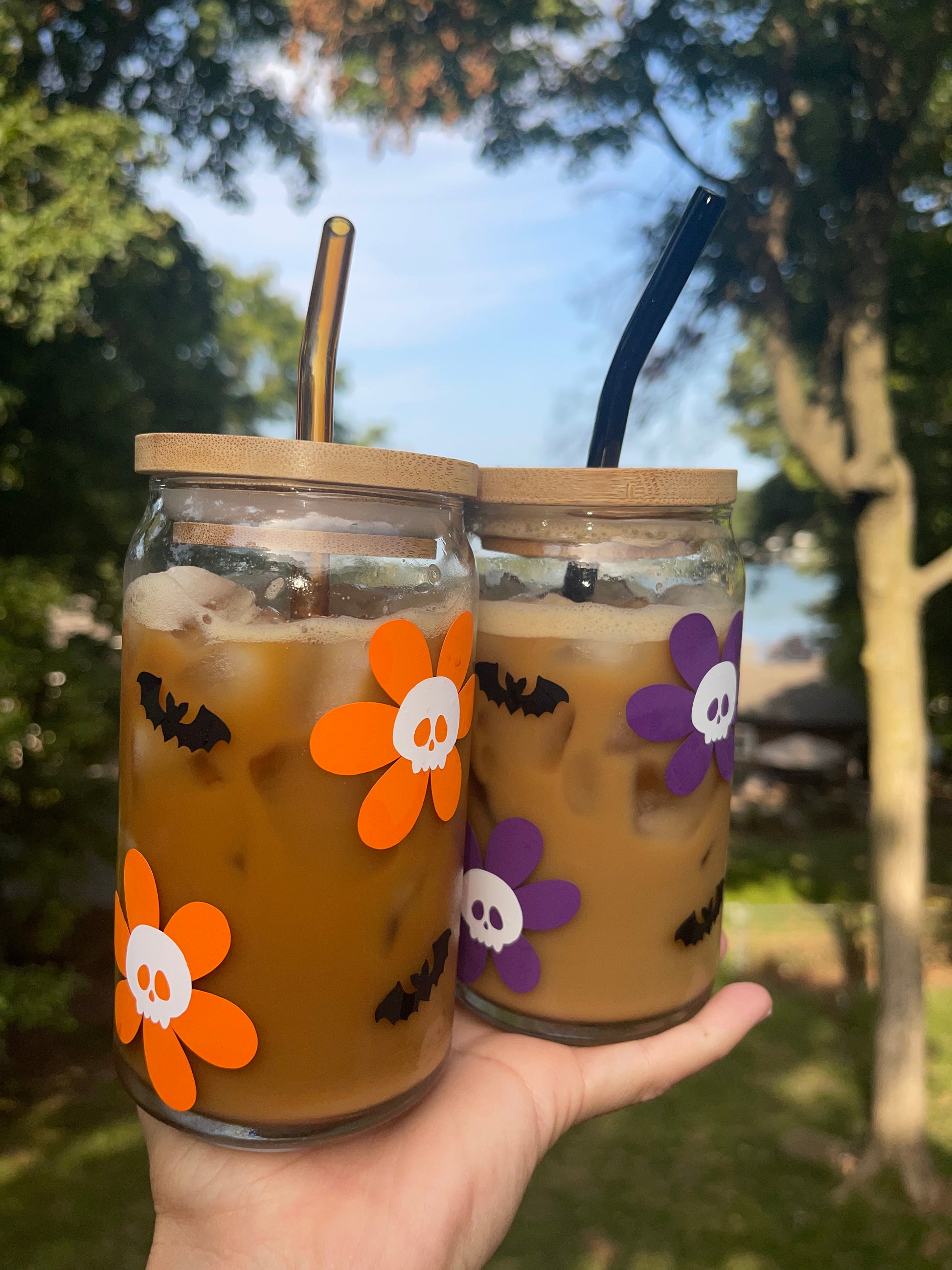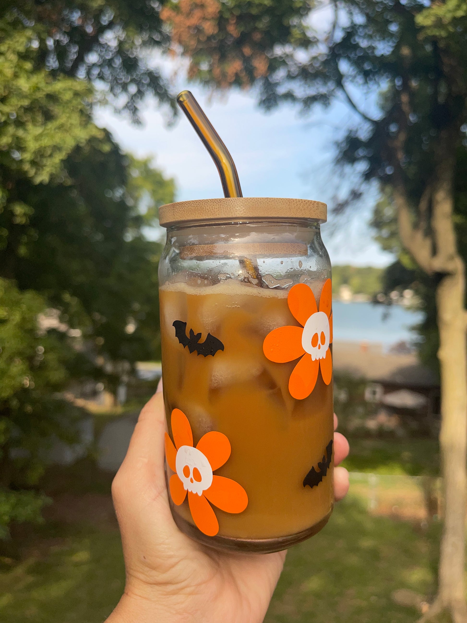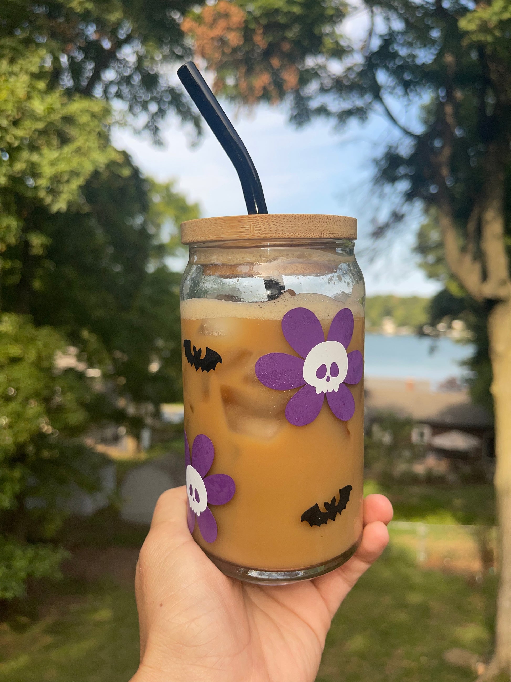 16 or 20 oz libbey can glass decorated with permanent adhesive vinyl in a skeleton and groovy flower design
