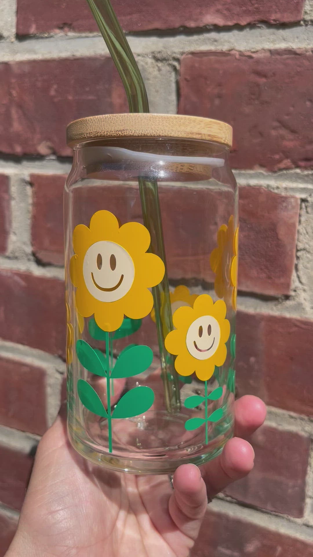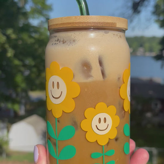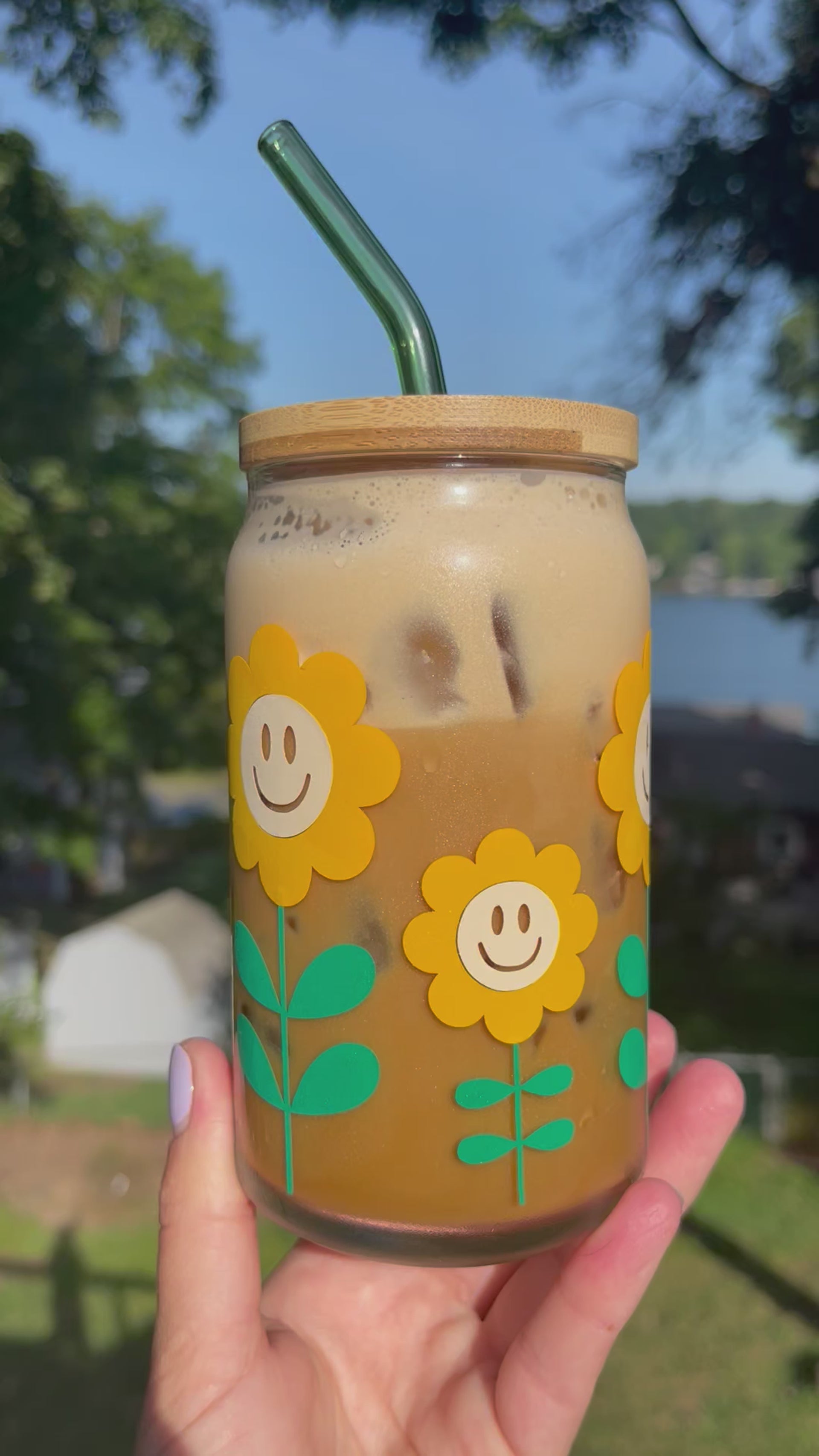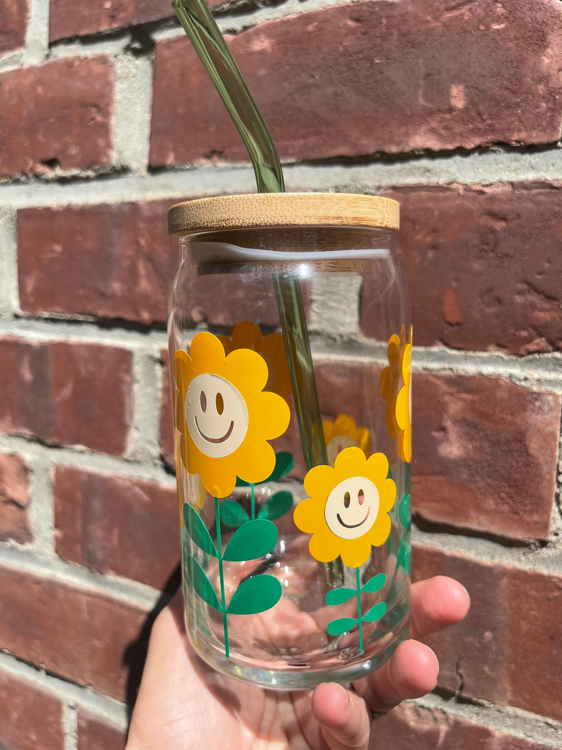 16 or 20 oz libbey can beer glass in a full wrap smiling sunflower design. permanent adhesive vinyl decals are hand wash only!