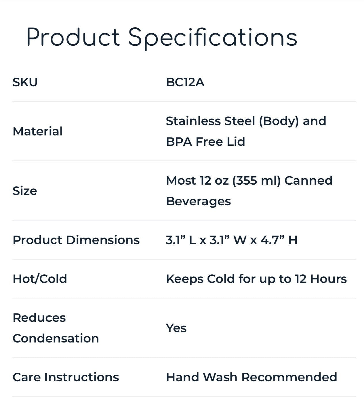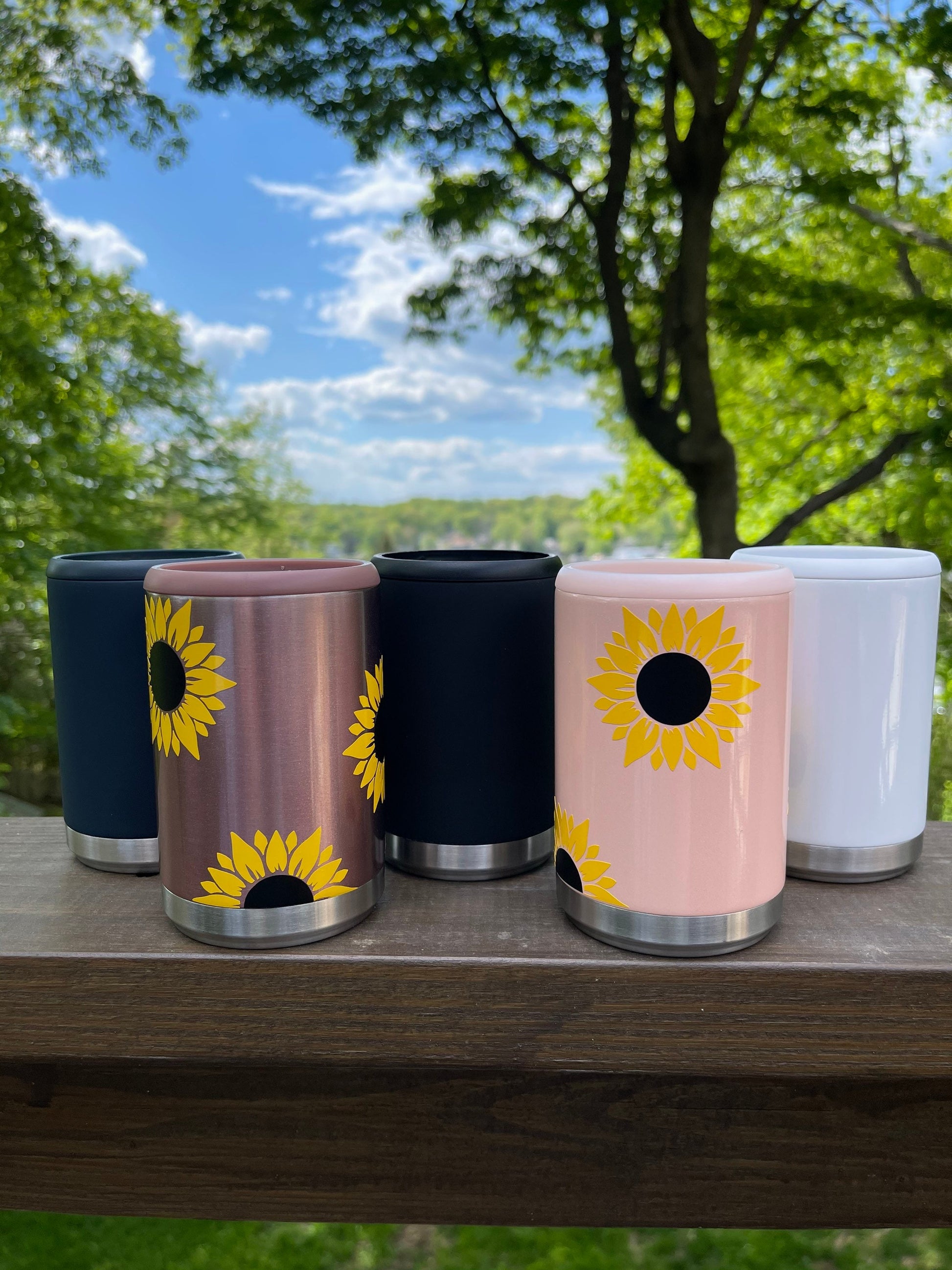 ITEM DESCRIPTION Insulated Beer Can Cooler Stainless steel 12 oz can holder Keeps can cold for up to 12 hours DESIGN OPTIONS: Sunflowers 3” name See pictures for colors Message me for custom color orders! CAN COMPATIBILITY: Most 12 oz beer and soda cans
