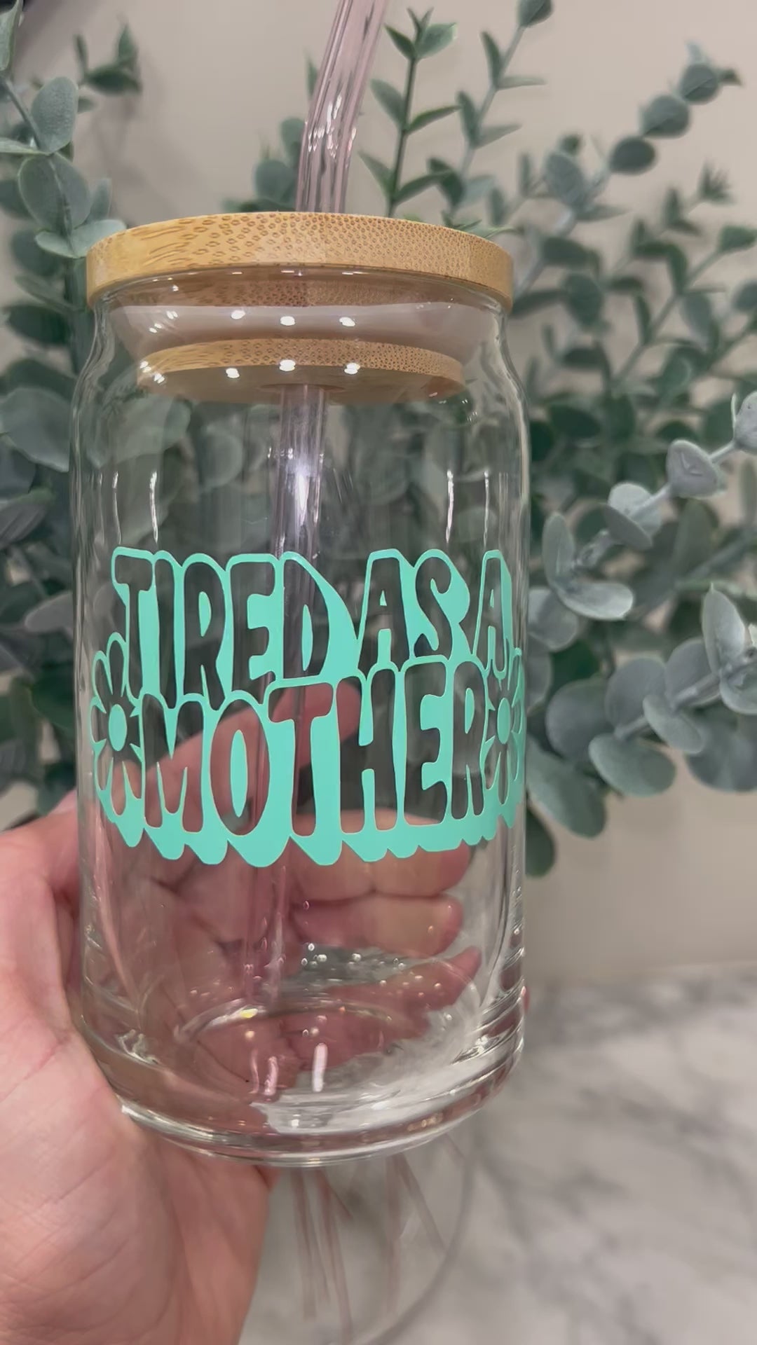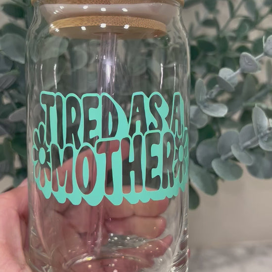 16 or 20 oz beer can glass with tired as a mother logo in permanent adhesive vinyl.